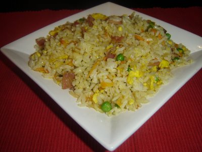 Frite os ovos em bastante óleo, desfazendo-os em bocadinhos, sem deixar cozer muito. Limpe os camarões, esfregue-os com sal e fécula de milho e passe por água. Seque com um pano e tempere com sal e óleo de sésamo. Aqueça o wok com óleo aromatizado e frite o camarão, já descascado. Junte a carne de porco assada e o cebolinho, todo cortado em pedaços pequenos. Tempere com sal, molho de soja e óleo de sésamo. Junte o arroz cozido de véspera. Frite em lume médio até os grãos de arroz estarem soltos. Junte os ovos pouco antes de servir